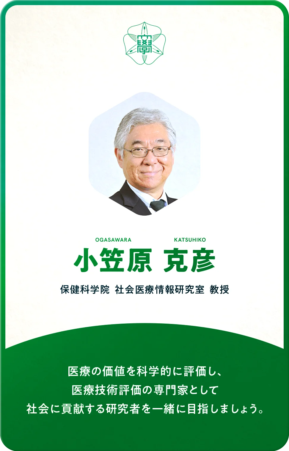 医療技術評価(HTA)の知識と実践を学ぶことで、持続可能な医療という大きな社会課題について考え、国際機関や政策分野で貢献できる視点と専門性を養います。